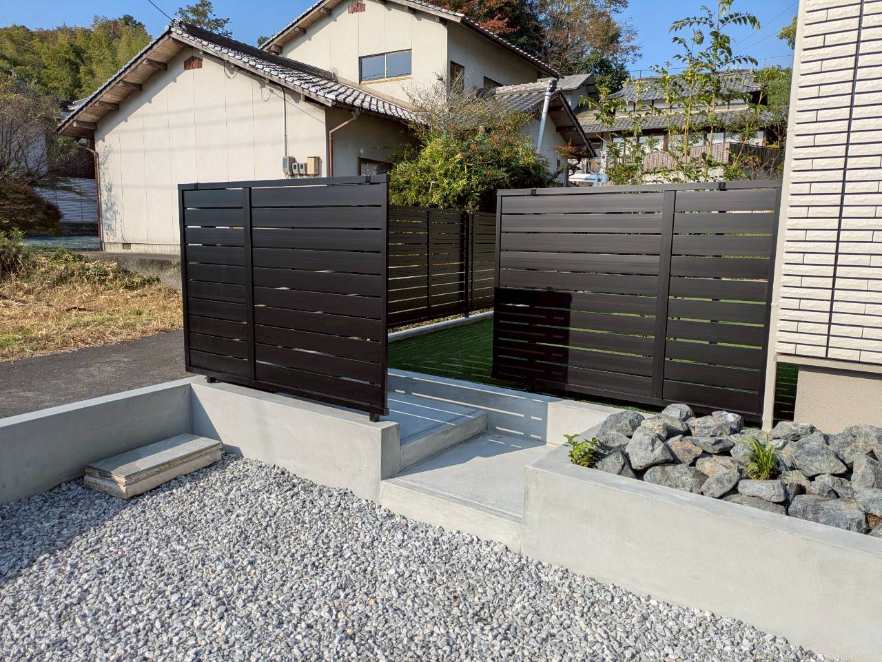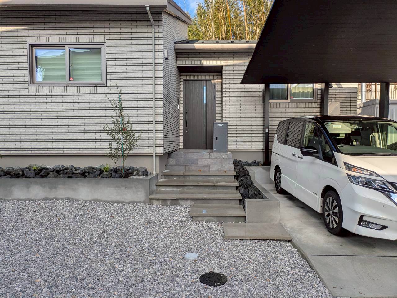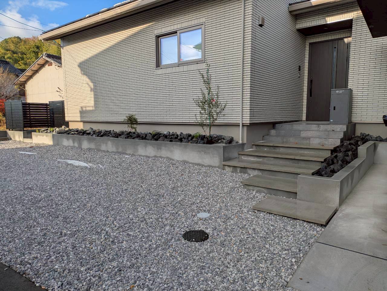 敷地に段差がある事から、車が止められるのかを心配されておりました. あえて階段や土留めなどを作って凹凸感を出すことでお洒落になりました☆.。