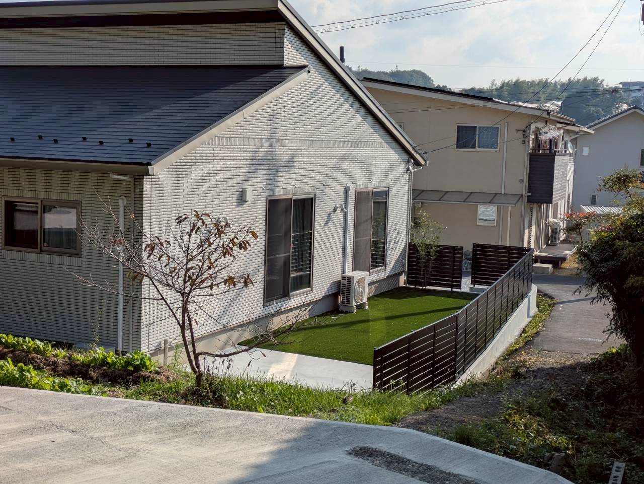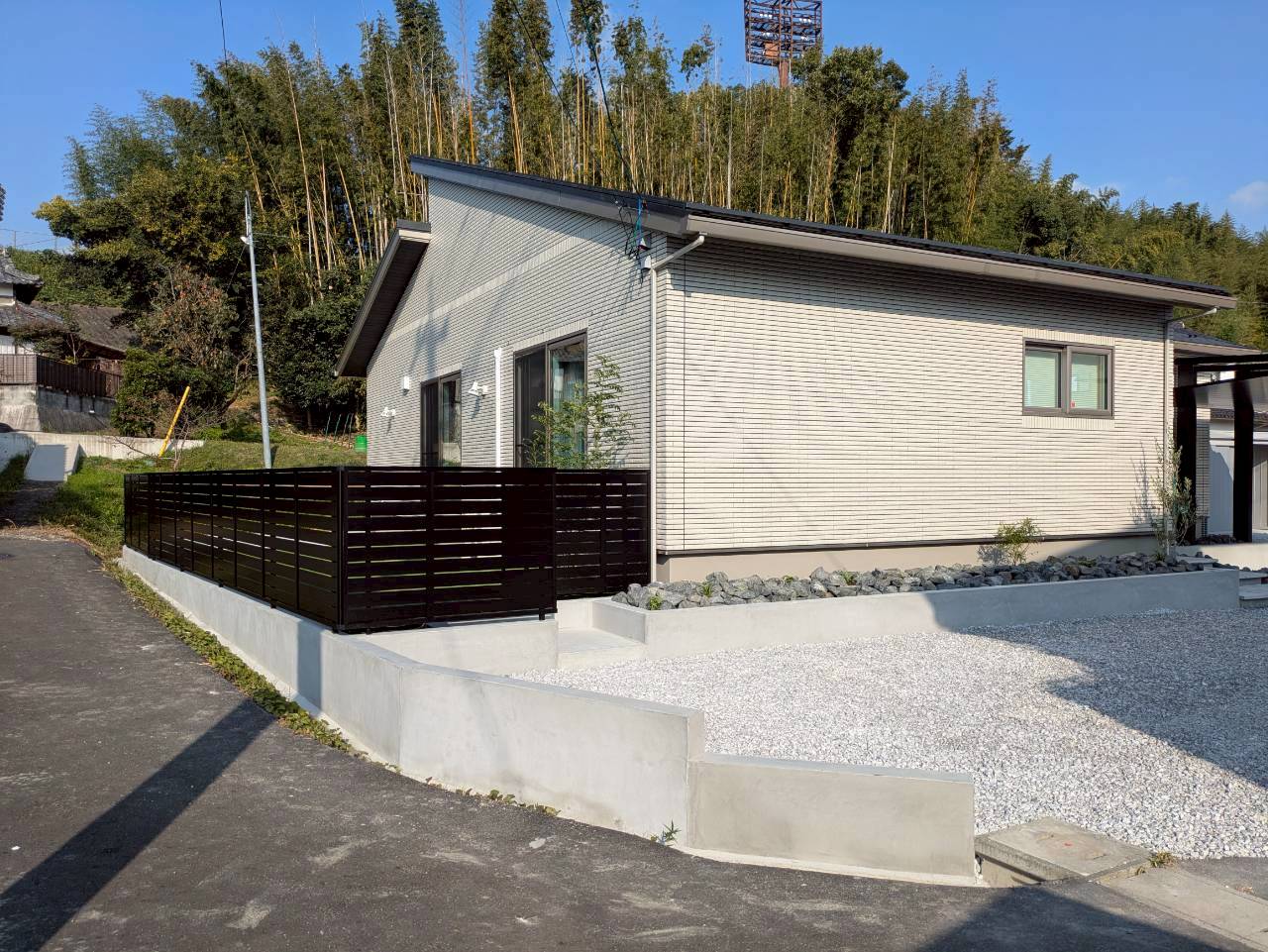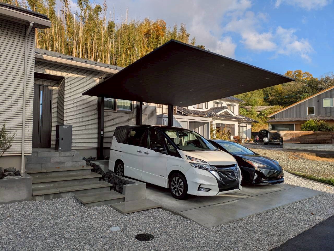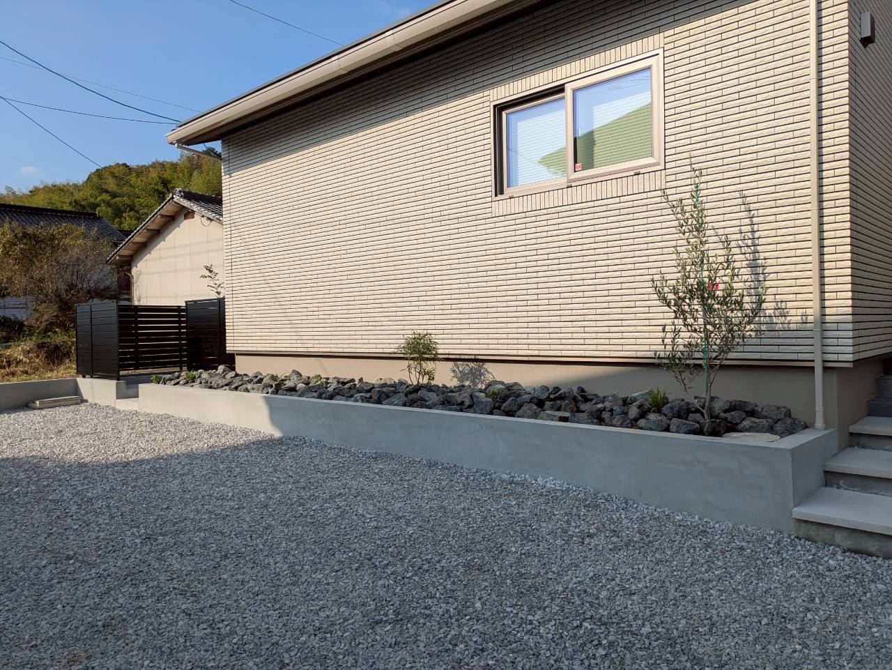 敷地に段差がある事から、車が止められるのかを心配されておりました. あえて階段や土留めなどを作って凹凸感を出すことでお洒落になりました☆.。